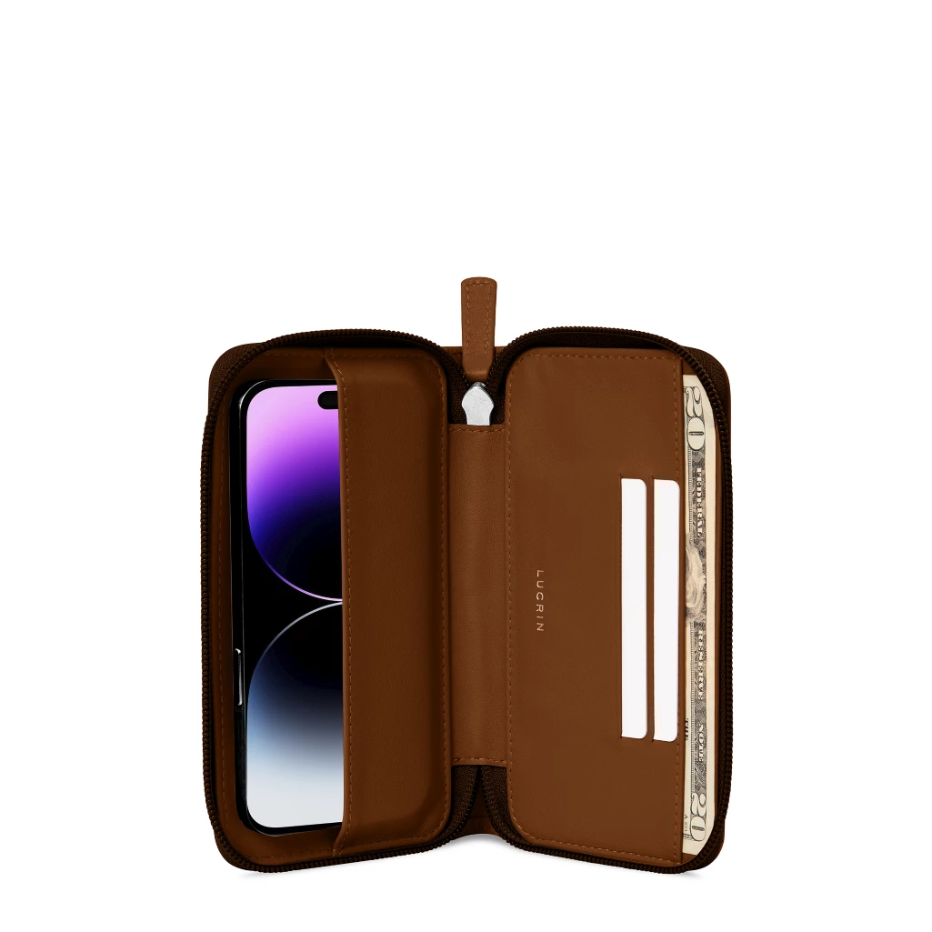 Denna plånboksfodral i läder för Phone 14 Pro från LUCRIN Geneva är ett måste-ha-accessoaren för alla de individer som ständigt befinner sig på resande. Vår läderaccessoar produceras i form av enkel design och tillverkas i premiumbaserade och högkvalitativt material. Utöver de praktiska egenskaperna så har våra duktiga hantverkare applicerat två platta fickor på insidan som ett led i att erbjuda dig möjligheten att lagar dina väsentligaste kort där du även kan få palts med kvitton och mindre kontanter under tiden som du befinner dig på språng. Accessoaren har designats med exklusivitet, funktionalitet och elegans i åtanke – något som återges i from av den sofistikerade läderytan i kombination med den vadderade interiören - något som säkerställer en perfekt passform som skyddar din enhet från en rad missöden. Detta fodral med dragkedja är ideal att ha med under alla dina utflykter – oavsett om du ska handla förnödenheter eller beger dig på en sen kväll ute på stan. Skapa ett helt unikt fodral genom att anpassa det i form av önskad läder, färg, sömnad och gravyr.