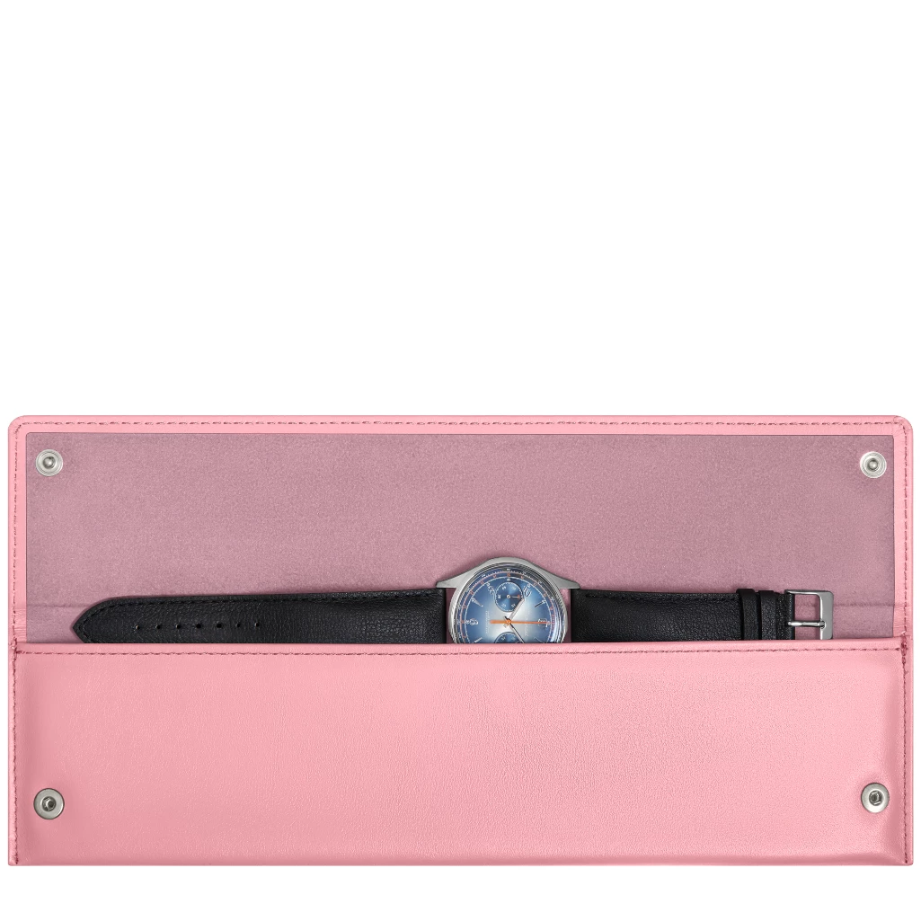 Rektangulär mjuk klockhållare. Klaff med 2 tryckknappar. Tillverkat i full grain läder.