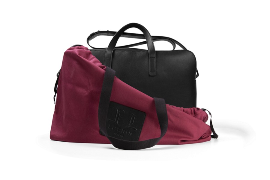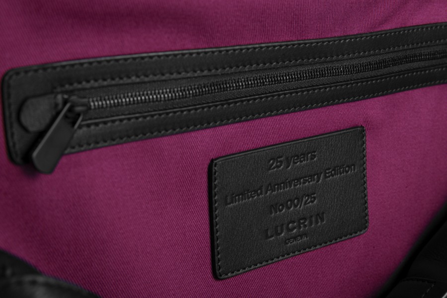 Special Limited Edition for the 25th Anniversary of Lucrin in authentic Black Calf Leather and Red Garnet Cotton Lining. Original leather creation numbered 1 to 25, with an exclusive logo commemorating the 25 years of the brand.