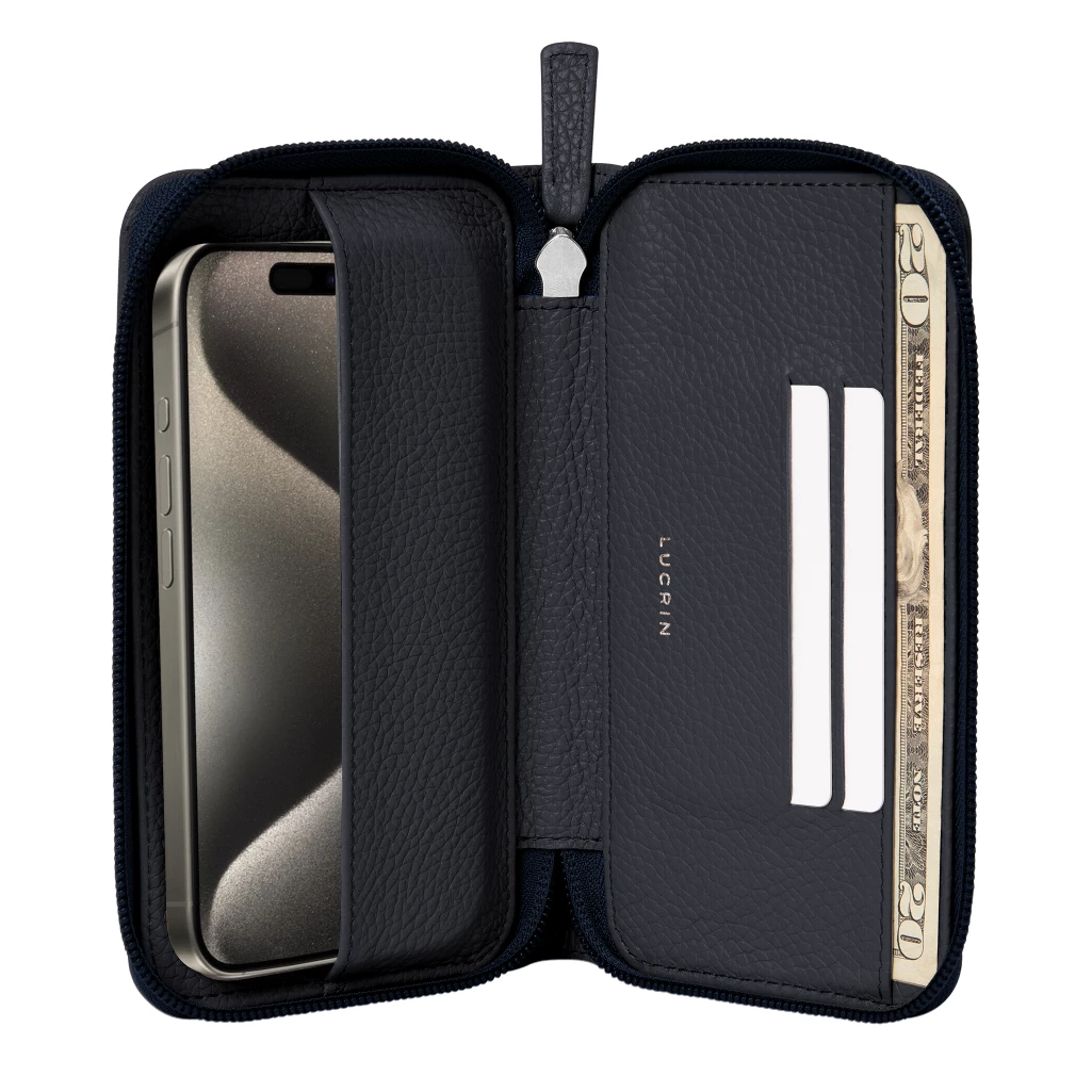 Njut av elegansen hos LUCRIN Genèves läderplånbok med dragkedja för iPhone 15 Pro Max, det ultimata resesällskapet med en elegant och modern design. Denna allt-i-ett-plånbok försluts med dragkedja, något som erbjuder dig en säker och elegant förvaring av dina viktigaste tillhörigheter så som kort, kontanter, telefon och dylikt. Plånboksfodralet i läder för iPhone 15 Pro Max är perfekt utformat med en perfekt balans mellan rymlighet och kompakthet, något som gör den enkel att få ned i fickan eller väskan. Din enhet skyddas av ett 360-gradersskydd som gör att du kan känna dig lugn under tiden som du befinner dig på språng. Plånboken med dragkedja pryds av minimalistiska silverdetaljer, där LUCRIN Geneva-loggan utstrålar en sofistikerad elegans. Gör ditt fodral mer personligt genom att välja från ett brett utbud av exklusiva lädertyper, fängslande färger och graveringsalternativ. För en extra touch av förfining kan du välja kontrasterande sömmar som förhöjer väskans attraktionskraft. Njut av stil och funktionalitet med vår utsökta läderplånbok som även applicerats med en dragkedja.